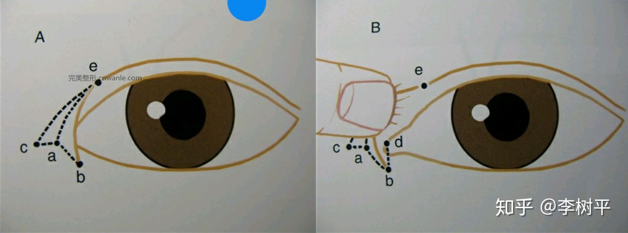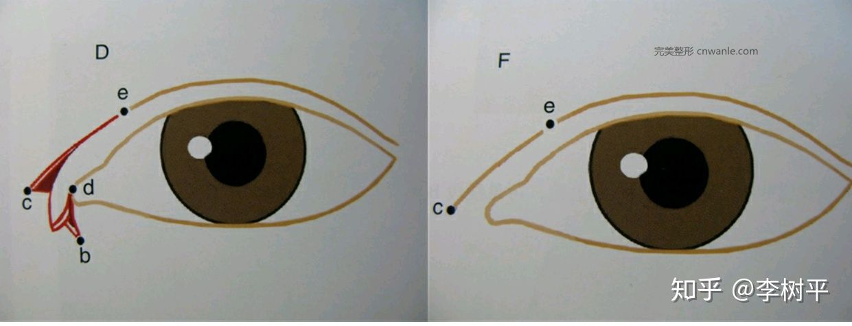 看的懂嗎?沒關(guān)系,確實很復雜,在小小的內(nèi)眼角上畫出那么多線,只要醫(yī)生明白就好。這只是書本上的經(jīng)典設計,每個醫(yī)生在此基礎上都有自己的改良心得。