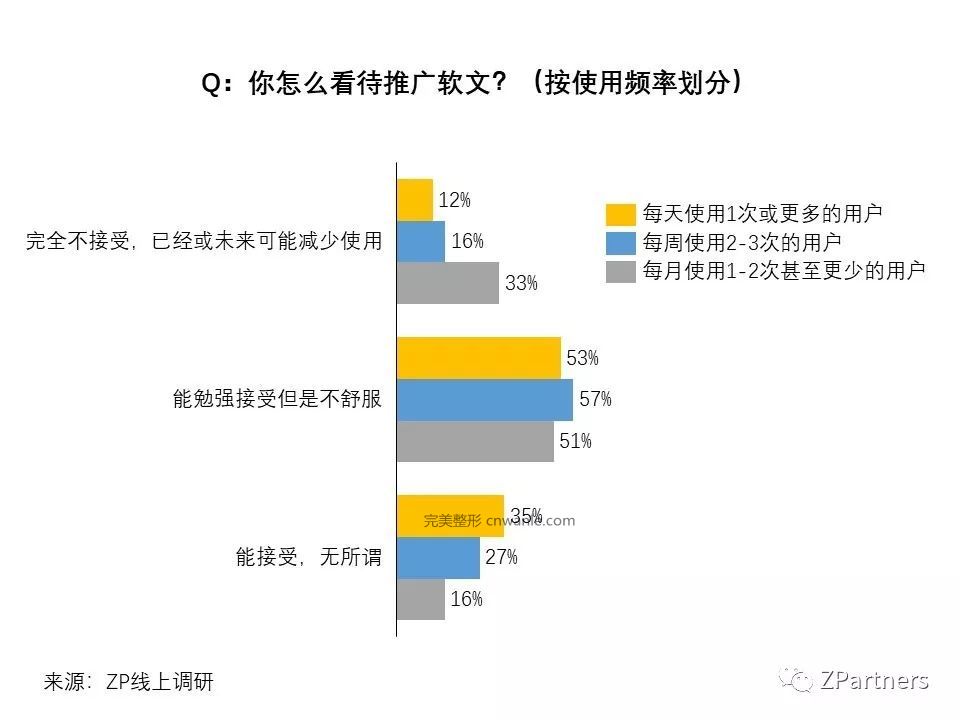 值得肯定的是,越高頻的用戶對廣告的接受度越高。在擁躉們的眼中廣告軟文瑕不掩瑜,還是有很多好看的帖子可以被挖掘到。